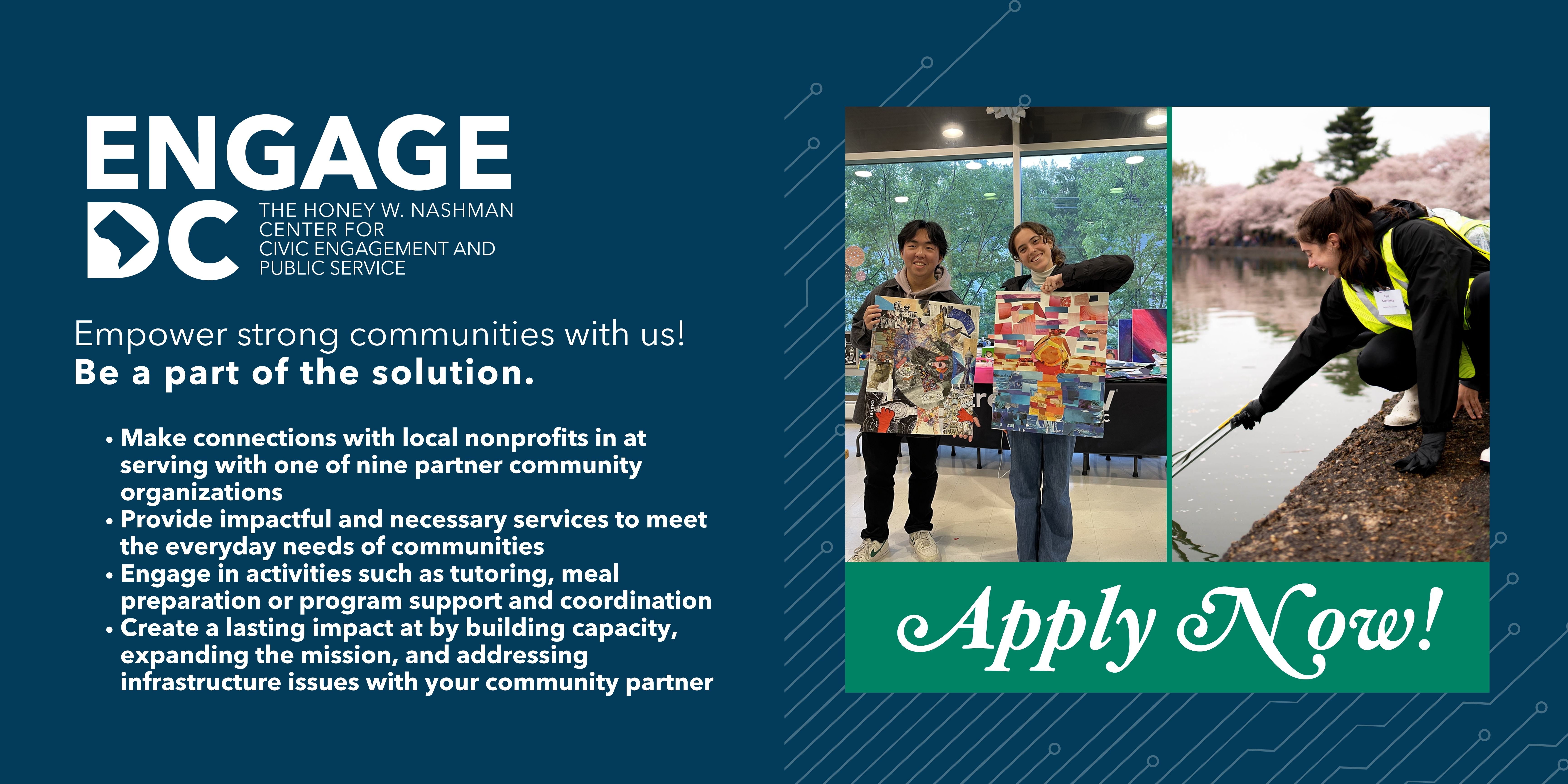 Through engageDC, GW students serve with one of nine partner community organizations in Washington, D.C. Students provide service to meet the everyday needs addressed by the organization such as tutoring, meal preparation, or program support and coordination. In addition, students work with the organization to address issues that build the organization’s capacity, expand the mission, or address infrastructure issues. For instance, engageDC participants can work on program evaluation, volunteer management, web design or the development of new program areas. engageDC students to gain new perspectives by working on their leadership development and creating a diverse network at GW and beyond the campus of people committed to social justice.